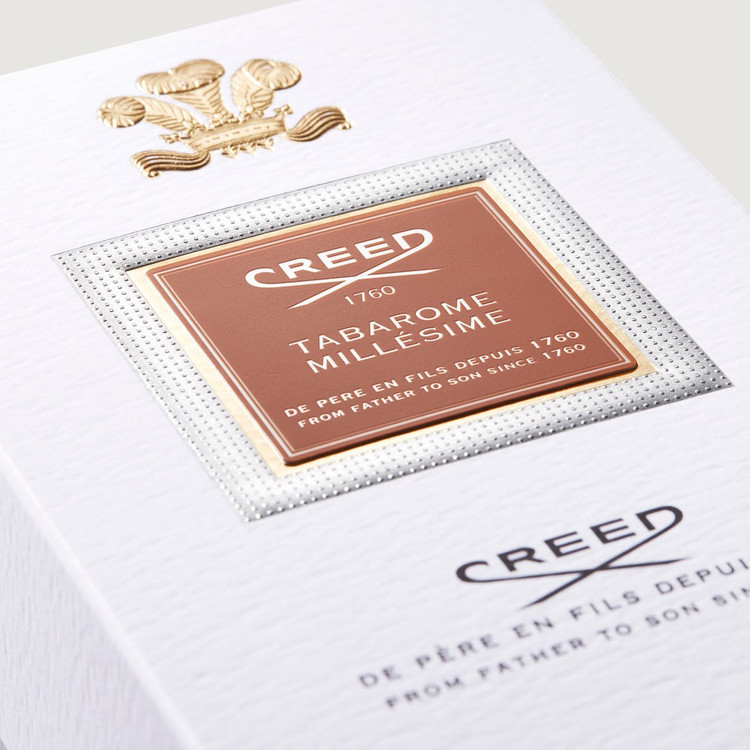 بطری شفاف و مینیمال Tabarome با حک طلایی نام Millesime، نمادی از اصالت برند کرید و استفاده از بهترین مواد اولیه در ساخت هر شیشه است.