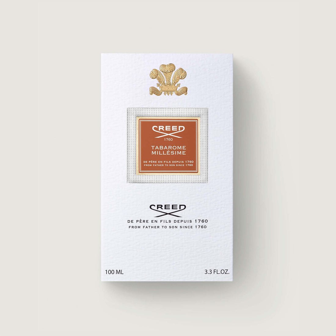 بطری شفاف و مینیمال Tabarome با حک طلایی نام Millesime، نمادی از اصالت برند کرید و استفاده از بهترین مواد اولیه در ساخت هر شیشه است.